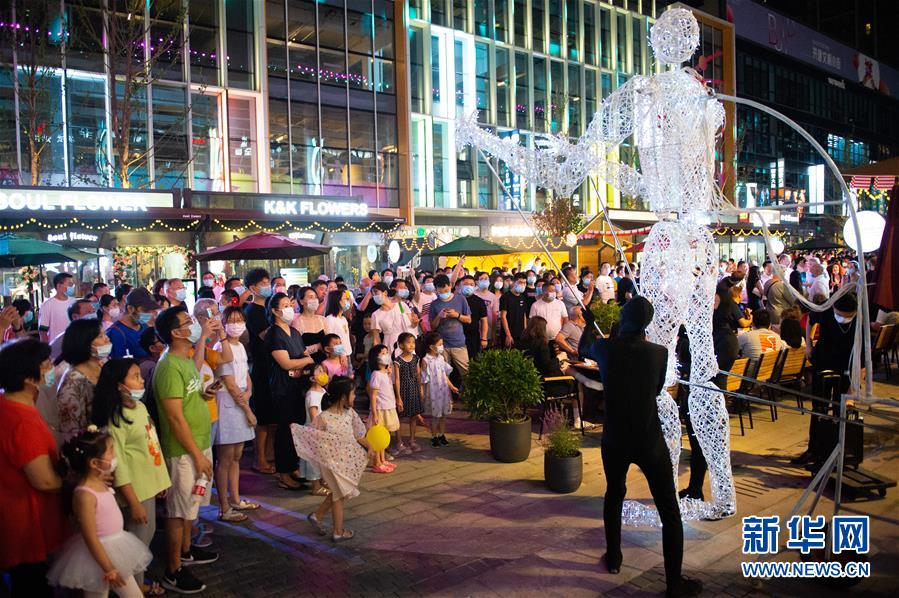 8月8日晚,市民在望京小街商業(yè)街觀看巨型人偶表演。當(dāng)日,作為北京消費(fèi)季活動(dòng)的一部分,北京市朝陽(yáng)區(qū)的“潮朝陽(yáng)”消費(fèi)季活動(dòng)正式重啟,位于朝陽(yáng)區(qū)的新興商業(yè)街望京小街舉辦開街嘉年華活動(dòng)。新華社記者 陳鐘昊 攝