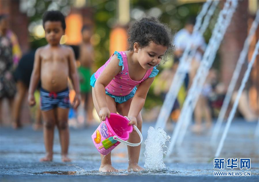 8月8日,孩子們在德國法蘭克福一處噴泉內(nèi)戲水。 當日,法蘭克福遭遇高溫天氣,最高氣溫達37攝氏度。 新華社記者 逯陽 攝