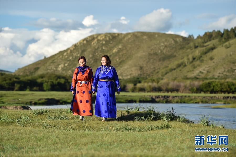 在內蒙古自治區(qū)鄂溫克族自治旗伊敏蘇木,艾吉瑪(左)和母親烏仁在伊敏河邊散步(8月6日攝)。