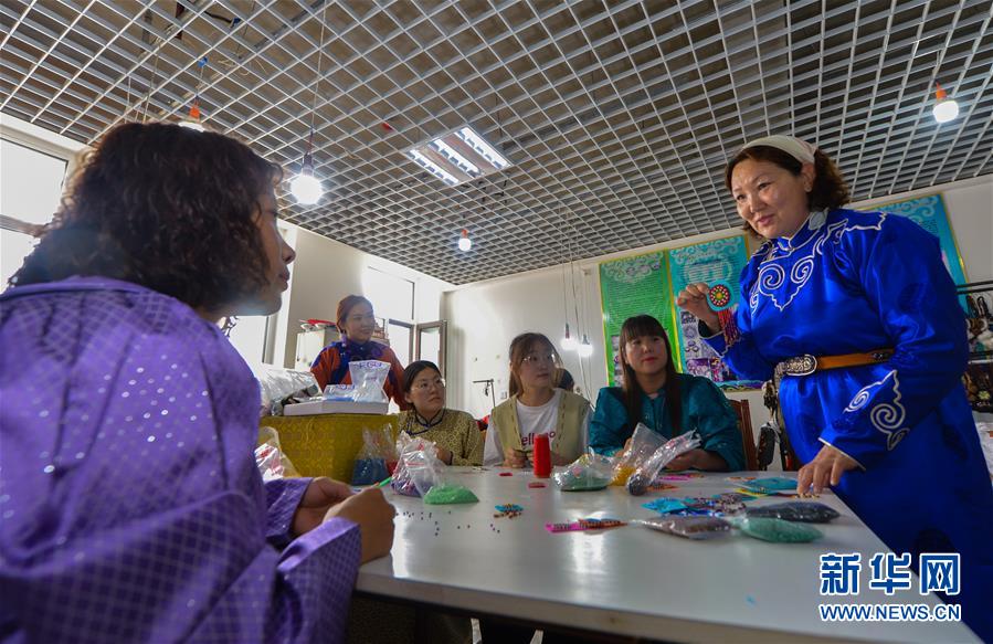 在內(nèi)蒙古自治區(qū)鄂溫克族自治旗巴彥托海鎮(zhèn)太陽花傳承發(fā)展中心,脫貧戶敖登圖雅(左)向?yàn)跞式桓蹲约褐谱骱玫氖止に嚻罚?月6日攝)。新華社記者徐欽攝。