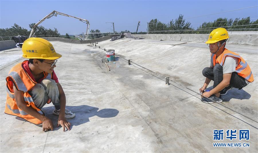 8月10日,工人在京雄城際鐵路霸州北站建設工地進行屋面坡層校核。京雄城際鐵路霸州北站站臺雨棚混凝土結(jié)構施工日前全部完成,目前霸州北站已全面轉(zhuǎn)入裝飾裝修和機電安裝階段,預計2020年底投入使用。京雄城際鐵路是連接北京市區(qū)、大興機場和雄安新區(qū)的重要干線。建成后,將進一步完善京津冀區(qū)域高速鐵路網(wǎng)結(jié)構,便利沿線群眾出行,對于推動京津冀協(xié)同發(fā)展和支撐建設雄安新區(qū)具有重要意義。新華社記者李曉果攝。
