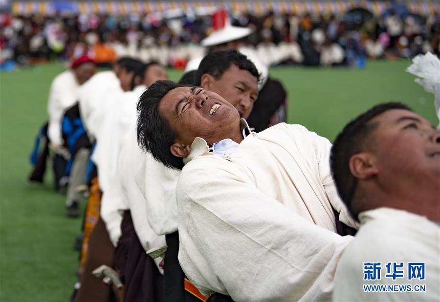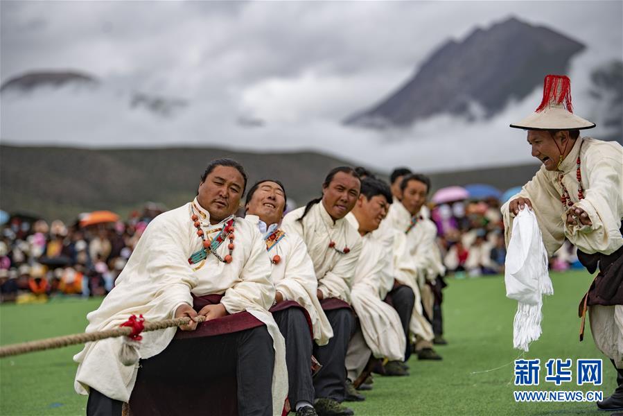 8月10日,當(dāng)雄縣牧民在拔河比賽中。新華社記者晉美多吉攝。