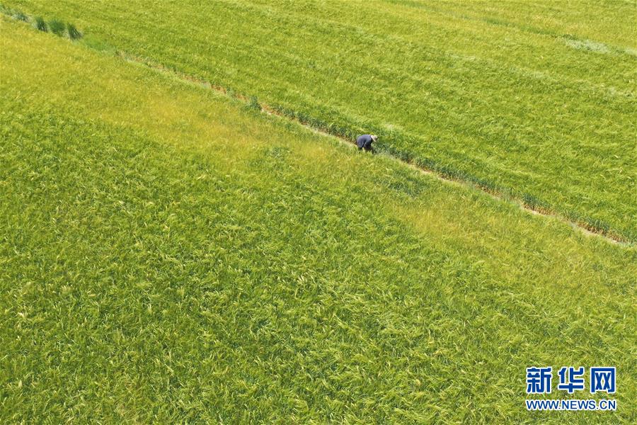 甘肅省金昌市永昌縣下四壩村村民徐文國(guó)在地里勞作(7月10日攝,無(wú)人機(jī)照片)。新華社記者 杜哲宇 攝