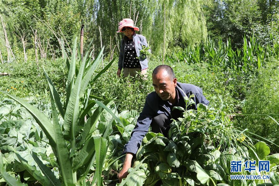 甘肅省金昌市永昌縣下四壩村村民徐文國(guó)和妻子在自家的菜園里采摘蔬菜(7月10日攝)。新華社記者 杜哲宇 攝