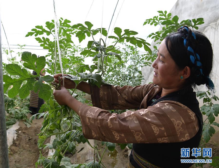 合作社成員拉姆在大棚內修剪瓜秧(8月2日攝)。新華社記者 李賀 攝