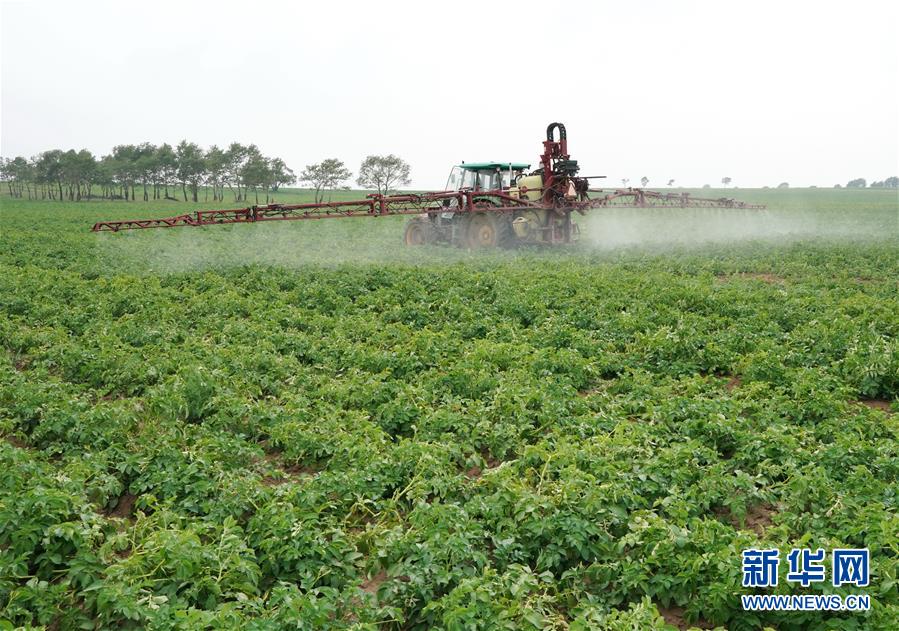 8月12日,在尚義縣三工地鎮(zhèn)有德元村,農(nóng)民使用機(jī)械設(shè)備在田間給旱作馬鈴薯噴灑農(nóng)藥。新華社記者 楊世堯 攝
