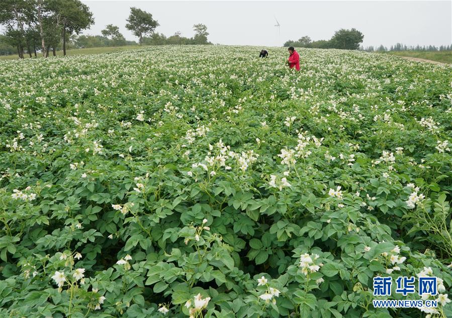 8月12日,在尚義縣七甲鄉(xiāng)媽奶溝村,農(nóng)民在田間管護(hù)旱作馬鈴薯。新華社記者 楊世堯 攝