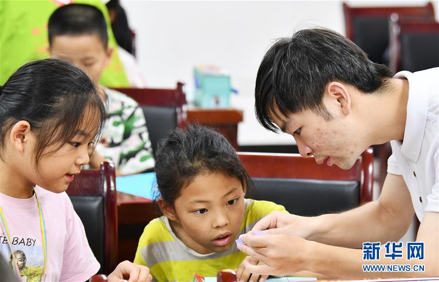 8月13日,在貴州省思南縣雙塘街道麗景社區(qū)易地扶貧搬遷安置點,志愿者在給孩子們上音樂課。今年暑假期間,在貴州省銅仁市思南縣雙塘街道麗景社區(qū)易地扶貧搬遷安置點,來自北京有研集團和思南當?shù)氐闹驹刚邆兝檬钇跁r間,給安置點的孩子們進行音樂、體育、手工、安全教育等課程輔導,幫助搬遷戶照看孩子,讓孩子們在學習中度過一個快樂而有意義的暑假。新華社記者楊文斌攝