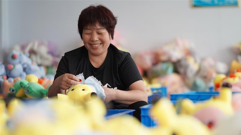7月13日,河北省內(nèi)丘縣一家玩具生產(chǎn)企業(yè)工人在加工毛絨玩具。