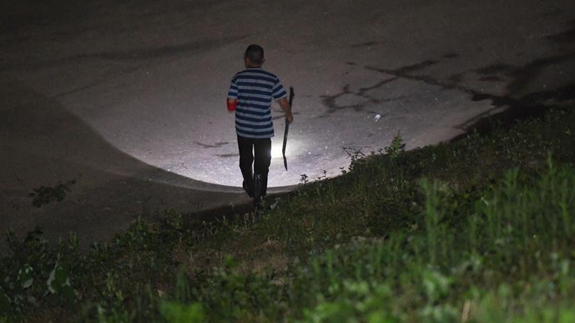 在岳陽市君山區(qū)的洞庭湖大堤上,工作人員在夜晚巡堤查險(xiǎn)。