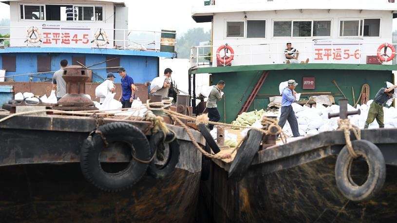 7月14日,當(dāng)?shù)卮迕裢簧习徇\(yùn)砂石袋。當(dāng)?shù)胤姥床块T組織船只裝載砂石袋等防汛物資,運(yùn)往圩堤保防汛。