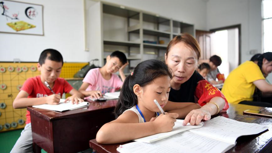 7月16日,在安徽省宿松縣洲頭鄉(xiāng)中心小學(xué)集中安置點(diǎn),教師志愿者輔導(dǎo)孩子們完成暑假作業(yè)。