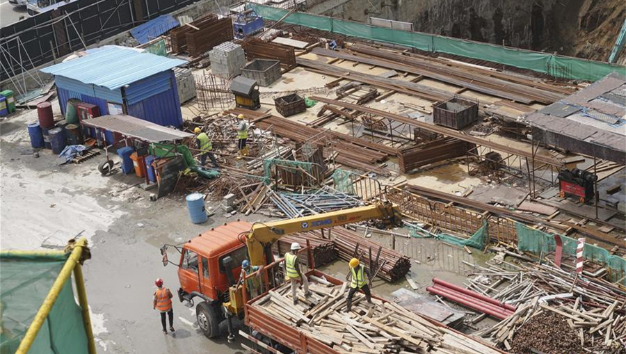 6月21日,在斯里蘭卡首都科倫坡,工人在中國港灣科倫坡房建項(xiàng)目工地上作業(yè)。