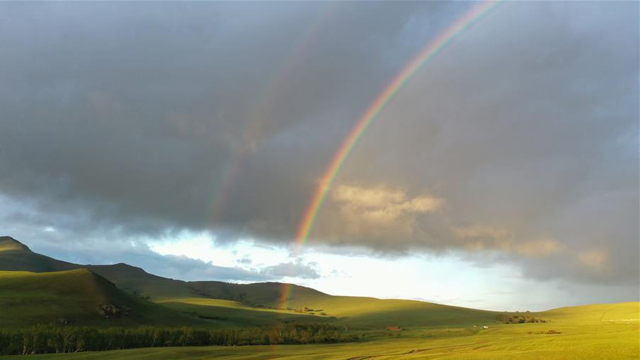 這是6月3日拍攝的阿魯科爾沁草原上的彩虹(無人機照片)。