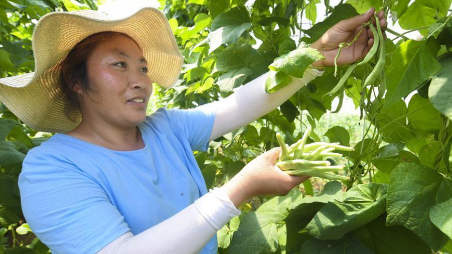 8月2日,已脫貧的建檔立卡貧困戶吳冬梅在河北省大廠回族自治縣現(xiàn)代農(nóng)業(yè)科技示范園區(qū)一家企業(yè)采摘蔬菜。