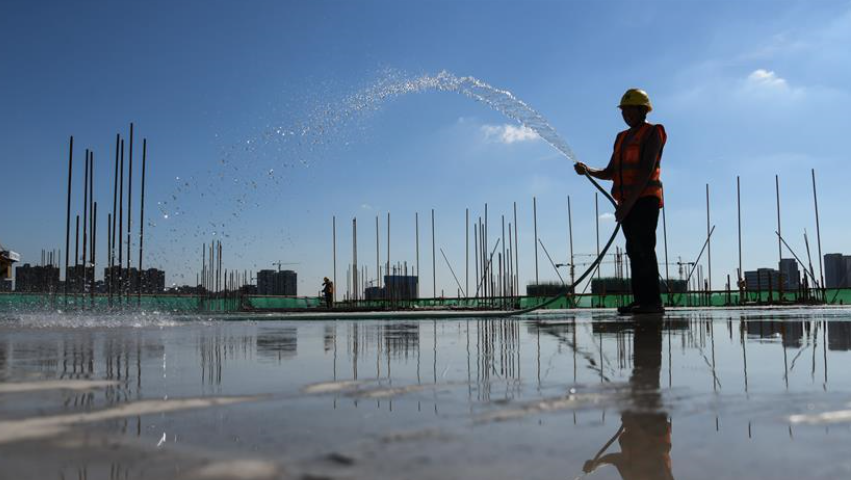 8月3日,工人在長江文創(chuàng)產(chǎn)業(yè)園項目工地工作平面澆水降溫。