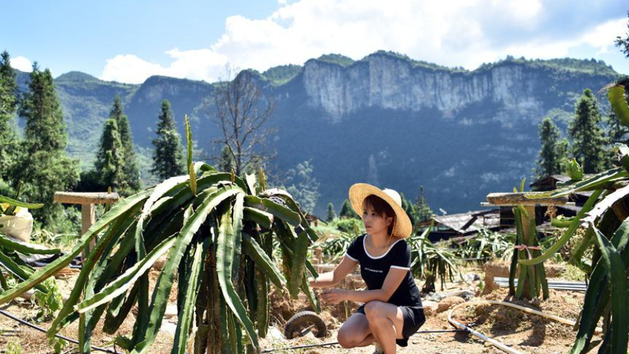8月3日,在碗米坡鎮(zhèn)首八峒村,種植基地負責(zé)人易潤菊采摘成熟的火龍果。