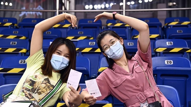 7月26日,在山東青島舉行的2019-2020賽季中國男子籃球職業(yè)聯(lián)賽(CBA)復(fù)賽第二階段(嶗山賽區(qū))比賽中,醫(yī)護(hù)人員、教師、公安戰(zhàn)線人士通過官方購票平臺(tái),完成包括核酸檢測(cè)在內(nèi)的相關(guān)流程后進(jìn)場(chǎng)觀看了上海久事隊(duì)迎戰(zhàn)山東西王隊(duì)的比賽。 觀賽期間,觀賽者須全程佩戴口罩,對(duì)號(hào)入座,嚴(yán)格保持間隔一米就座。退場(chǎng)時(shí),觀眾須按照自后向前、先兩邊后中間的順序,保持“一米線”社交距離有序退場(chǎng)。