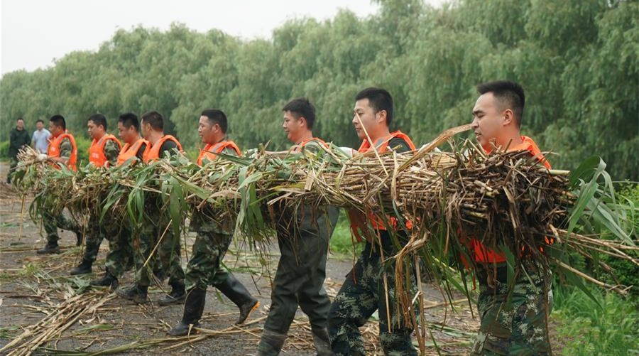 在位于江西省余干縣古埠鎮(zhèn)的齊埠聯(lián)圩上,武警江西總隊上饒支隊的60名戰(zhàn)士頭頂烈日,揮汗如雨,在泥水中處置一處堤壩坍塌險情。