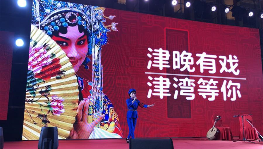 京劇愛好者在天津津灣廣場表演經(jīng)典京劇唱段。
