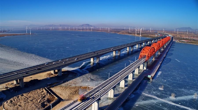 1月13日,京張高鐵官廳水庫特大橋鋪軌工作完成。京張高鐵全長174公里,是2022年北京冬奧會的重要交通保障線。