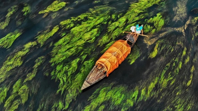 孟加拉國烏拉帕拉,漁船在水流和藻類的映襯下前行,畫面看起來就像水彩畫一般。
