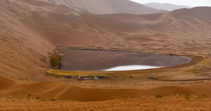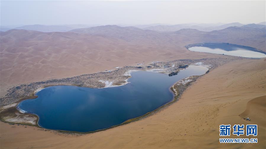 沙丘起伏的曲線陡變成高聳的沙山,碧藍(lán)的湖泊散落在沙海間。