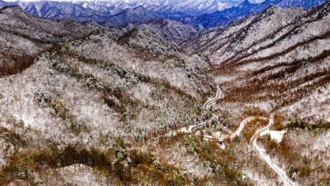 當(dāng)日,秦嶺初雪,色彩斑斕的秋色在白雪映襯下,美如畫卷,置身其間,恍若進(jìn)入童話世界