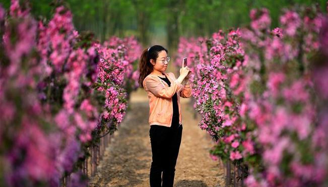 近日,河北省廊坊市安次區(qū)葛漁城鎮(zhèn)萬畝桃園、千畝海棠花田迎來花期,吸引游客前來踏春賞花。