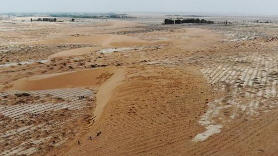 航拍甘肅民勤縣沙漠植樹現(xiàn)場