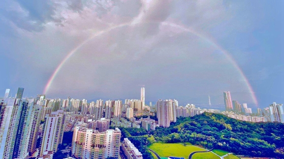 深圳雨后雙彩虹橫跨天際,景象絢麗唯美,引得路人紛紛駐足拍照。