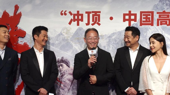 9月27日,電影《攀登者》導(dǎo)演李仁港(中)、演員吳京(左二)、張譯(左一)、王景春(右二)和何琳在首映禮上與觀眾見面。