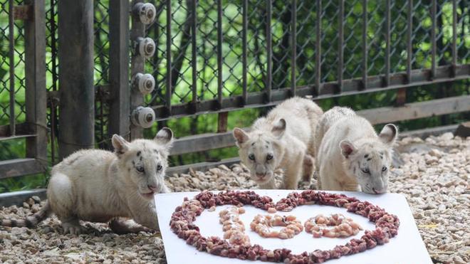 濟南野生動物世界五胞胎雪虎誕生滿百日,正式與游客見面。