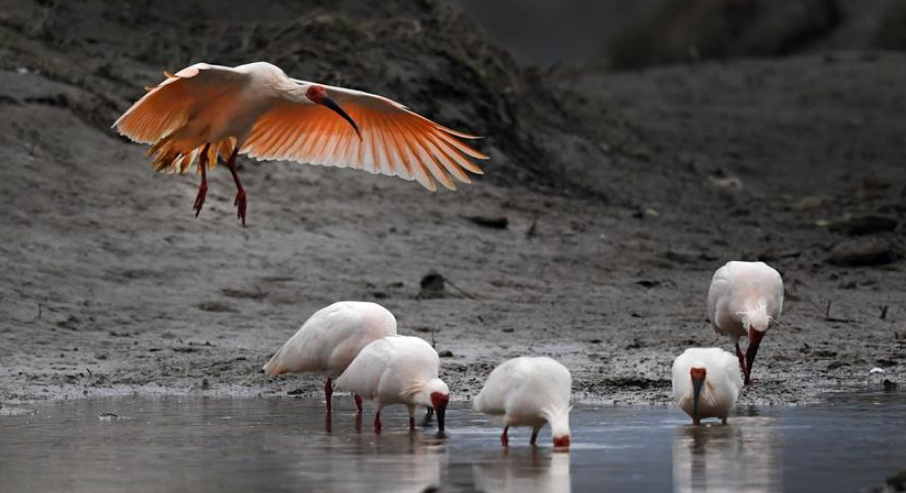 每年冬季,成群結(jié)隊(duì)的朱鹮飛翔在漢江及漢江支流的河灘、濕地,覓食、棲息,成為當(dāng)?shù)匾坏懒聋惖娘L(fēng)景線(xiàn)。?
