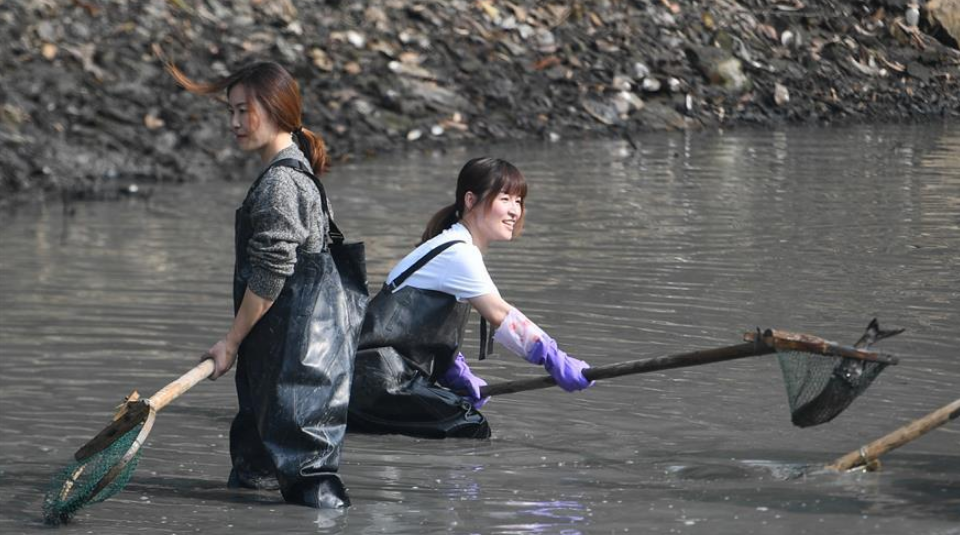 近日在杭州西溪國(guó)家濕地公園,漁夫們抽掉塘水清理淤泥,一批游客借用漁夫們的下水褲,體驗(yàn)“干塘”捕魚(yú)。