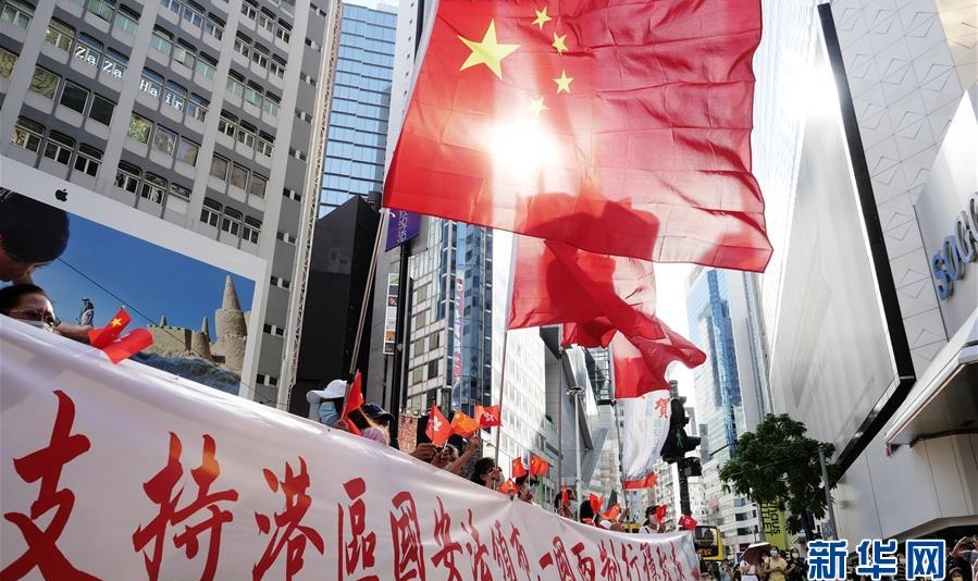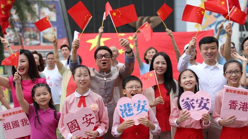 7月1日,香港市民在太平山頂廣場(chǎng)唱國(guó)歌。