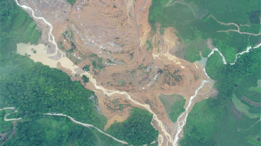 7月17日,一名地質勘查人員在湖南省石門縣南北鎮(zhèn)潘坪村雷家山滑坡現場查看災情。