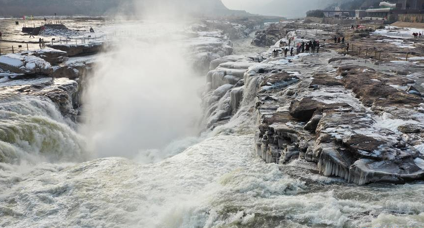 隆冬時節(jié),位于晉陜交界的黃河壺口瀑布飛濺的浪花在瀑布兩岸巖石上凝結(jié)形成冰瀑冰雕,成為冬季壺口瀑布景區(qū)一道奇特的景觀,吸引游人前往觀賞。