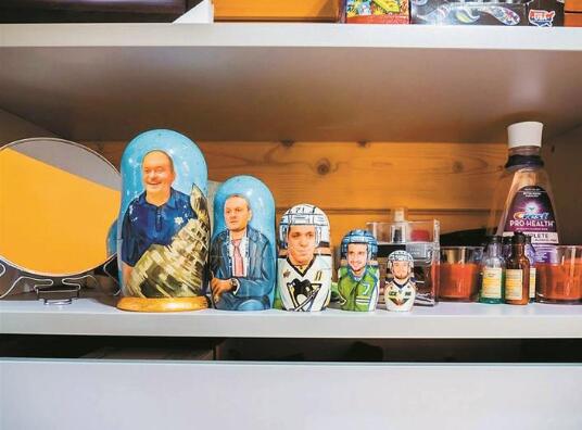 說起來,老烏沙科夫和中國也有點緣分,因為他的兒媳婦是一位來自中國杭州的女孩。烏沙科夫的家處于莫斯科郊外的富人區(qū),其實當你踏入他家大門,就能立刻感覺踏入了一個冰球運動員的世界。墻角里擺放著的全是冰球桿,家里的各種裝飾也都是由冰球桿以及各種海報組成的。最有趣的是,套娃和伏特加酒瓶上,都特別定制著老人的照片?!斑@個很棒!”記者指著套娃說道,而老烏沙科夫聳聳肩,表示很淡定。
