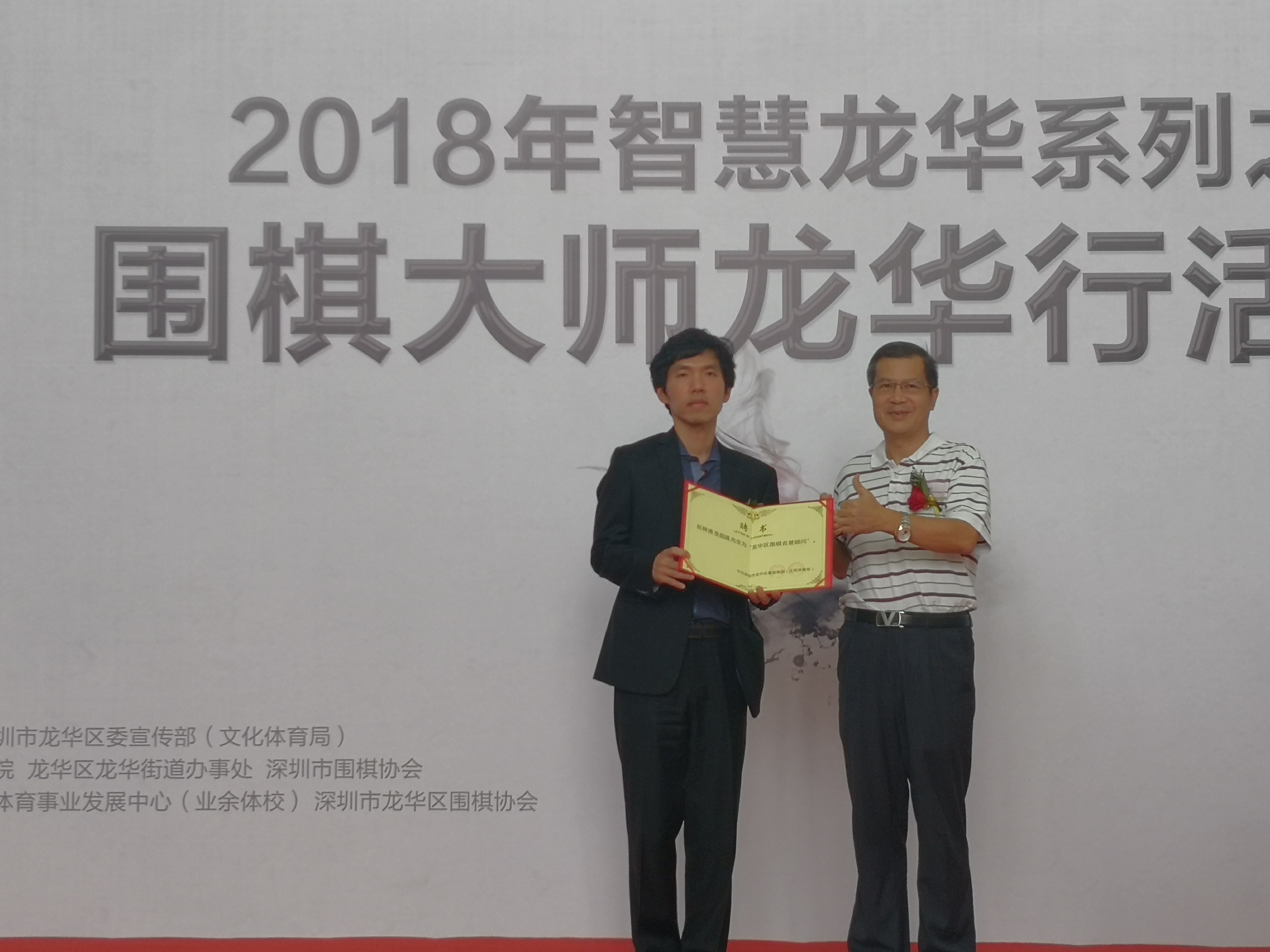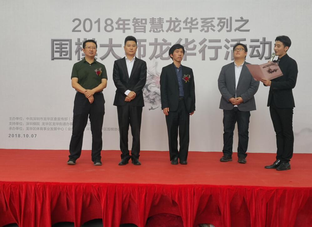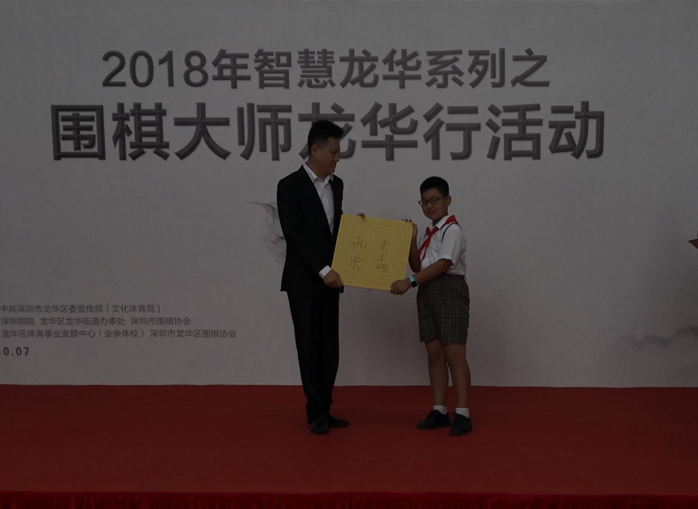 開幕式上,龍華區(qū)委副書記苗寧禮,龍華區(qū)委常委、宣傳部長(zhǎng)黃啟鍵及區(qū)文化體育局相關(guān)負(fù)責(zé)人等在百忙中前來為“智慧龍華”捧場(chǎng)加油。活動(dòng)在輕松熱鬧的歌舞中拉開帷幕,文化體育局負(fù)責(zé)人在致辭中對(duì)諸位圍棋大師的到來表示熱烈的歡迎,對(duì)活動(dòng)擴(kuò)大中華圍棋文化的傳播,推動(dòng)龍華區(qū)圍棋的發(fā)展給予了充分的肯定。隨后,黃啟健常委代表龍華區(qū)聘請(qǐng)李昌鎬大師擔(dān)任龍華區(qū)圍棋發(fā)展的名譽(yù)顧問并頒發(fā)了證書,李昌鎬則回贈(zèng)了簽名棋盤。緊接著,孔杰老師也給參加活動(dòng)的小棋手贈(zèng)予了簽名棋盤。在廣東圍棋總冠軍佟云老師簡(jiǎn)要介紹李昌鎬、孔杰的精采圍棋經(jīng)歷之后,活動(dòng)主持人還現(xiàn)場(chǎng)采訪了李昌鎬、孔杰,就兩人圍棋從業(yè)過程中的難記經(jīng)歷、精采賽事以及對(duì)人工智能圍的展望等進(jìn)行了提問,兩位大師的回答坦率、誠(chéng)懇,贏得了現(xiàn)場(chǎng)觀眾的陣陣掌聲?;顒?dòng)的高潮是李昌鎬、孔杰、車澤武、張亞博四位老師與龍華區(qū)的圍棋愛好者進(jìn)行多面打的活動(dòng),梁偉棠九段和徐瑩老師還進(jìn)行掛盤講解。
