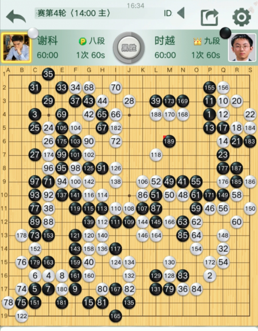 第二臺主將之戰(zhàn)謝科八段VS時(shí)越九段(對陣棋譜),時(shí)越最后勝出。時(shí)越首輪逆襲勝排名第二的楊鼎新九段,本輪再度逆襲得手,倒春寒味道十足。白棋耗費(fèi)心力經(jīng)營中腹,但因黑棋在邊空所得更大,白棋大模樣作戰(zhàn)失敗。之后黑棋守牢己方大空,相機(jī)壓縮白棋中腹模樣,白棋實(shí)空“干不夠”,直至認(rèn)輸。