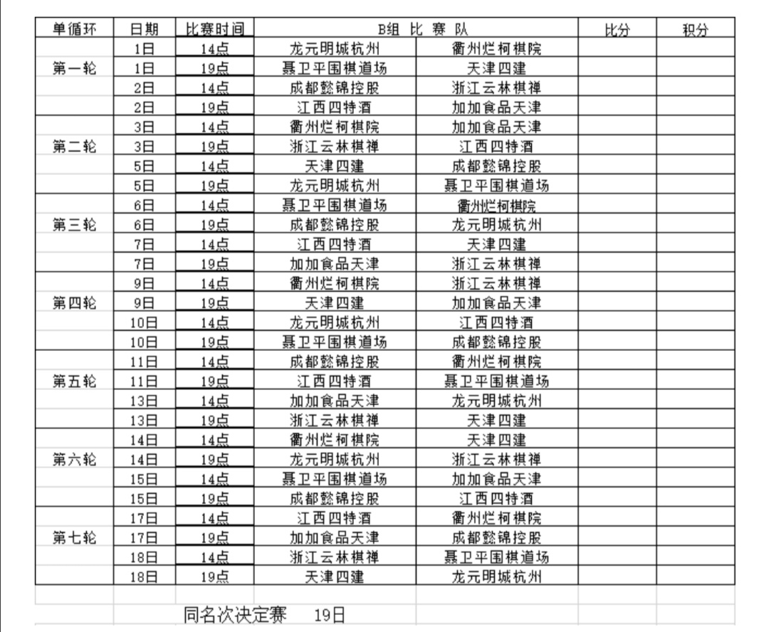 附2:2020年“華為手機(jī)杯”中國圍棋男子甲級隊(duì)聯(lián)賽網(wǎng)絡(luò)熱身賽AB兩組日程表