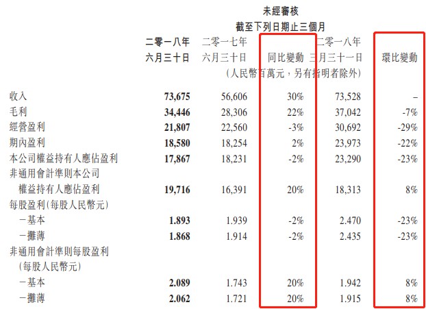 其實,如果單看上半年的業(yè)績報表,騰訊的業(yè)績還是可以的,收入、經(jīng)營盈利、凈利潤以及每股盈利都做到了雙位數(shù)增長,但要是對比2017年上半年的增長數(shù)據(jù),2018年的明顯就弱了很多。2017年上半年收入和凈利潤分別增長57%和64%。主要原因是2018年第二季度的拖累,利潤指標(biāo)環(huán)比出現(xiàn)了不同程度的下滑。