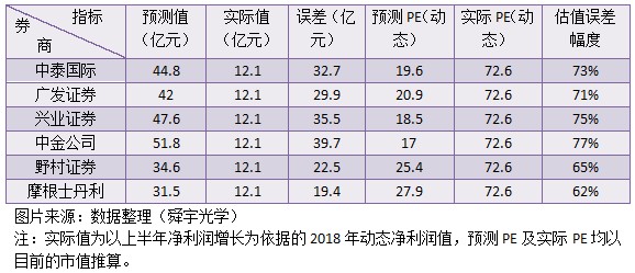 舜宇光學(xué)的市值為998億港元,僅為騰訊的3%,騰訊波動一個點的市值,就相當(dāng)于舜宇光學(xué)波動33.3%,肯定比不了。不過以打臉的程度來說,舜宇光學(xué)有點過了,預(yù)測值與實際值的估值誤差達70%左右,這臉打的確實響。