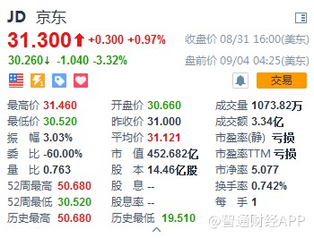 截至發(fā)稿,京東(JD)盤前跌3.32%,跌幅一度曾達4%。(林宥辰)