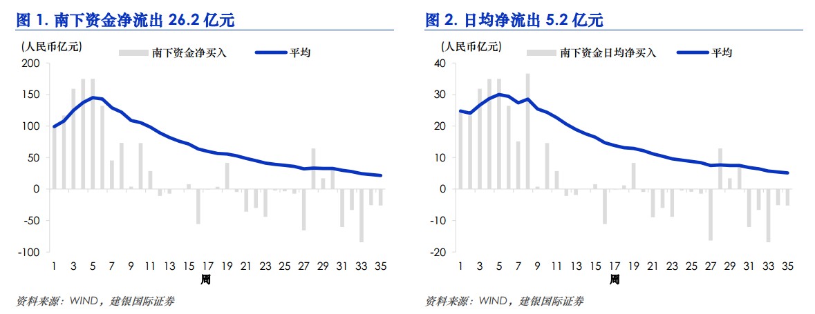 南下資金連續(xù)5周維持凈流出狀態(tài),凈流出量26.2 億元,環(huán)比增加 0.5 億元。買(mǎi)入賣(mài)出均維持低量,顯示南下資金情緒仍然較為謹(jǐn)慎。而上周人民幣兌港元反彈0.3%,不利于資金南下復(fù)蘇。