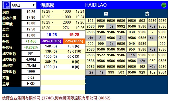 新股暗盤 | 海底撈(03690)暗盤收?qǐng)?bào)19.26元漲8.2% 每手賺1460元