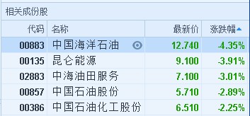 智通財(cái)經(jīng)APP獲悉,國際原油價(jià)格大跳水,港股石油股早盤股價(jià)遭重創(chuàng),截至9時(shí)20分,中海油(00883)跌4.35%,報(bào)價(jià)12.74港元,昆侖能源(00135)跌3.91%,報(bào)9.1港元,中石油(00857)跌2.89%,中石化(00386)跌2.25%。