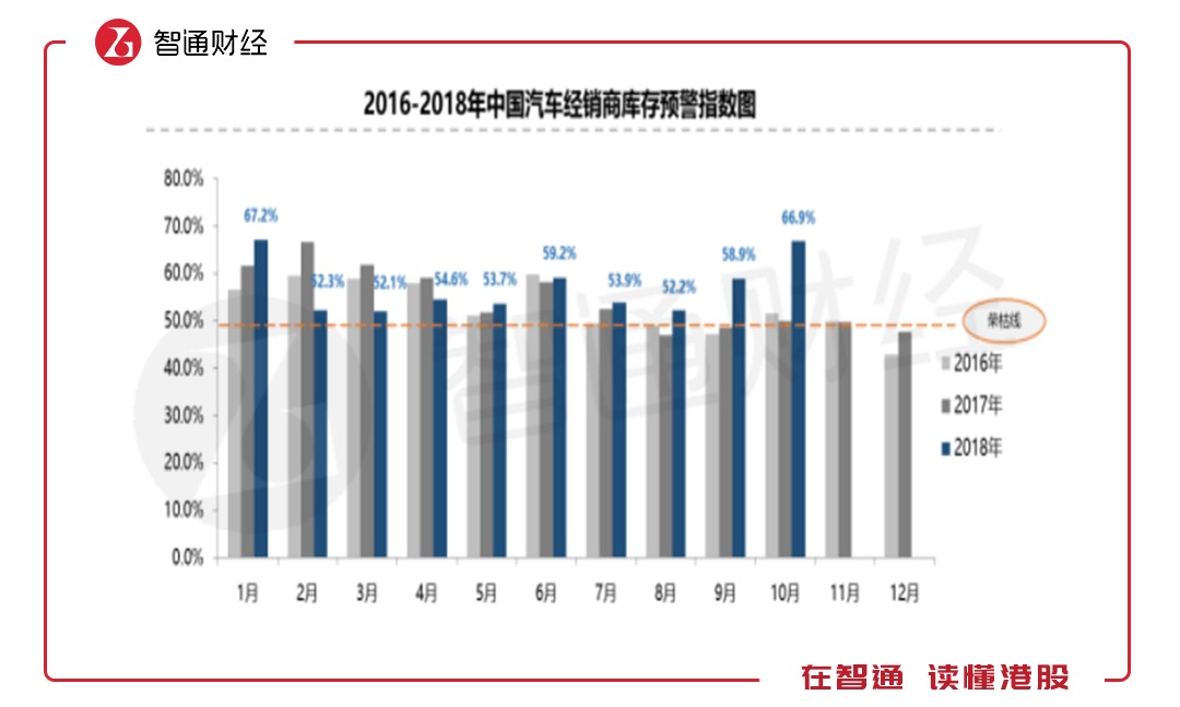 實際上,從汽車制造到最終消費者,流通過程要通過經(jīng)銷商,中汽協(xié)近日公布了經(jīng)銷商庫存預(yù)警指數(shù),顯示下半年以來,庫存預(yù)警指數(shù)均高于前兩年,10月份創(chuàng)出新高,預(yù)警指數(shù)達(dá)66.9%,而榮枯線為50%,汽車庫存堪憂,未來兩個月消化難度依然很大。