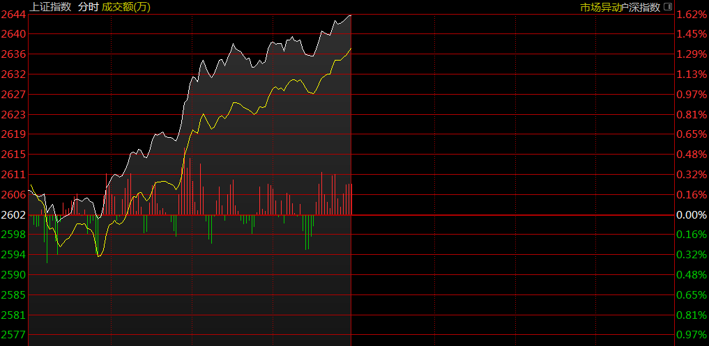 云財經2018年12月13日訊 截至早盤收盤,上證指數報2643點,漲1.60%;深證成指報7844點,漲1.90%;創(chuàng)業(yè)板指數報1356點,漲1.35%。盤面上,板塊全面上漲,高鐵、水泥、家電、機場航運等板塊逆勢上漲。